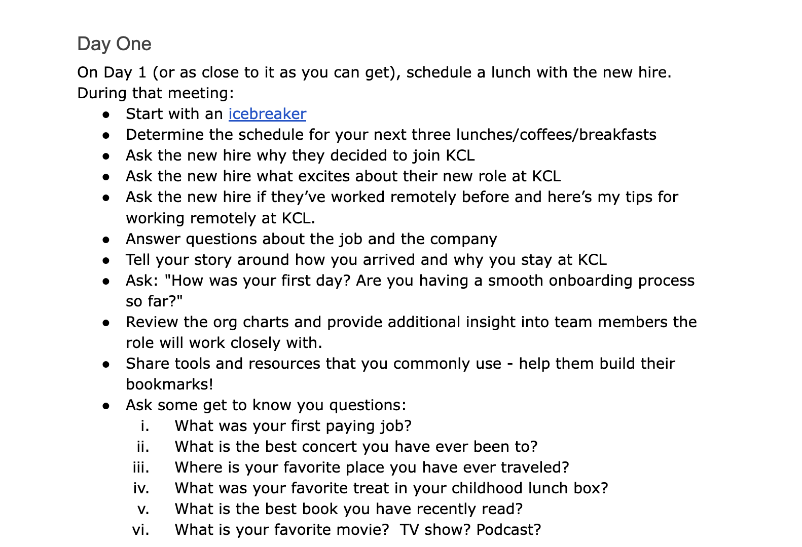 The Buddy Program at KCL is designed to support new hires in their remote onboarding experience by pairing them with an existing team member as a peer guide. The buddy provides insight into company culture, answers questions, and helps the new hire acclimate over four weeks through scheduled check-ins.