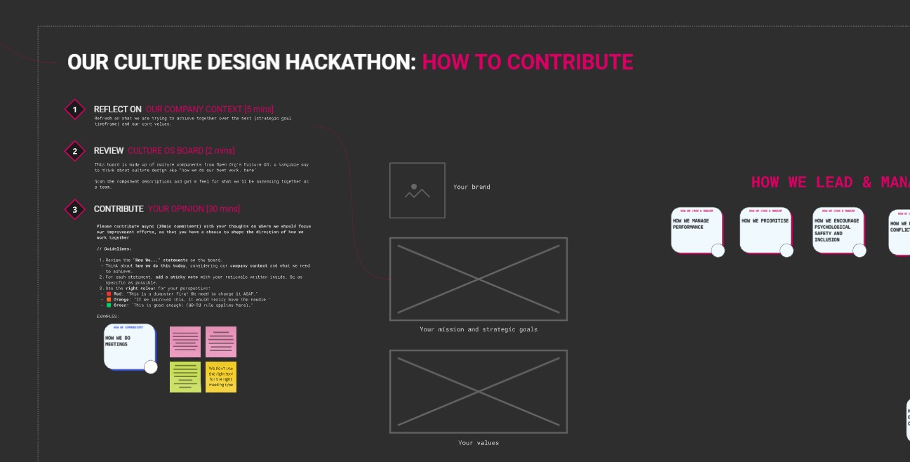 An entire toolkit for company culture design, built as a Miro template by the team at Open Org. Includes a personal diagnostic & heatmap, as well as a leadership team one, plus a company-wide hackathon template to run this with your entire org.