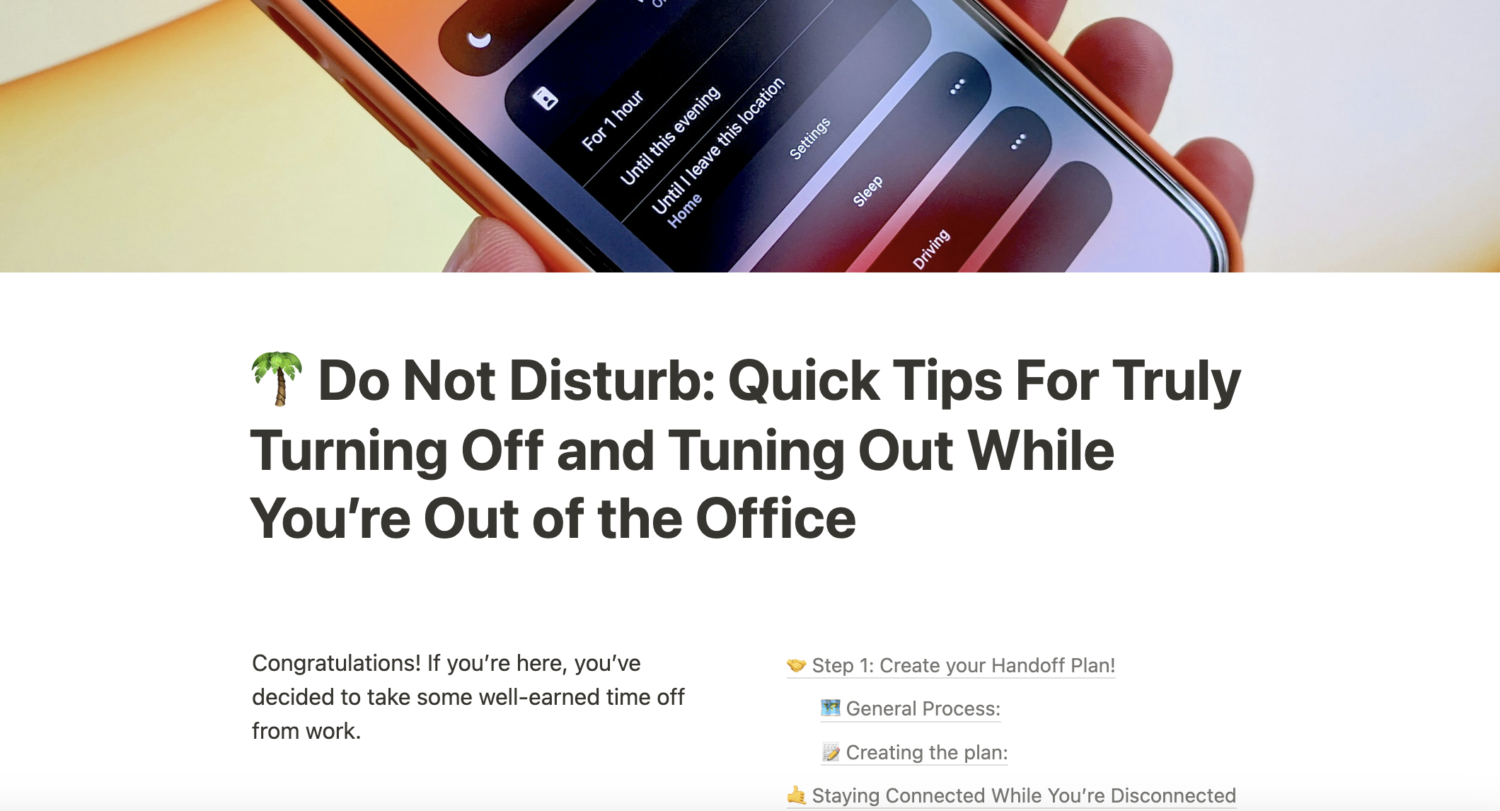 A guide to making the most of your time off by helping you prepare to be totally offline without leaving your team in the lurch. Tips for HR leaders, and a bonus section specific to parental leave.