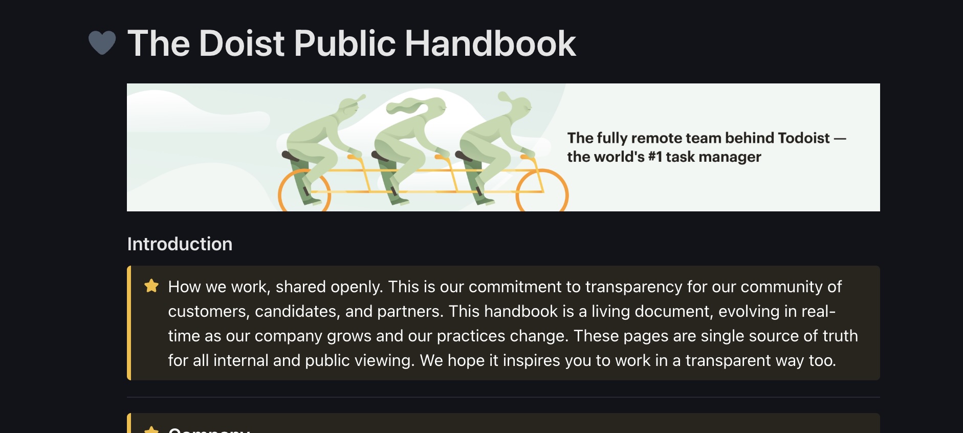Doist's incredible open employee handbook featuring some awesome pages on how they work (a.k.a. culture) and also a People section which is outstanding with pages on how they handle onboarding, compensation, non-linear career growth and AI.