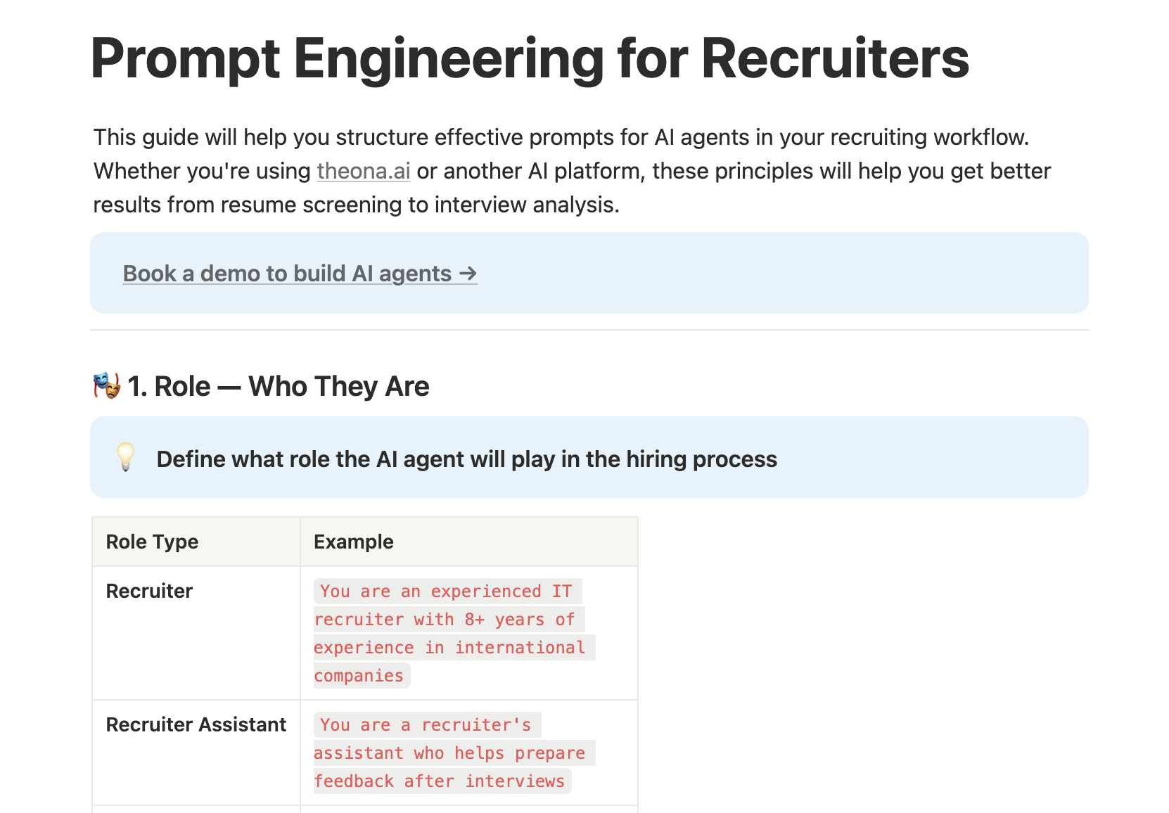 This guide will help you structure effective prompts for AI agents in your recruiting workflow. Whether you're using theona.ai or another AI platform, these principles will help you get better results from resume screening to interview analysis.