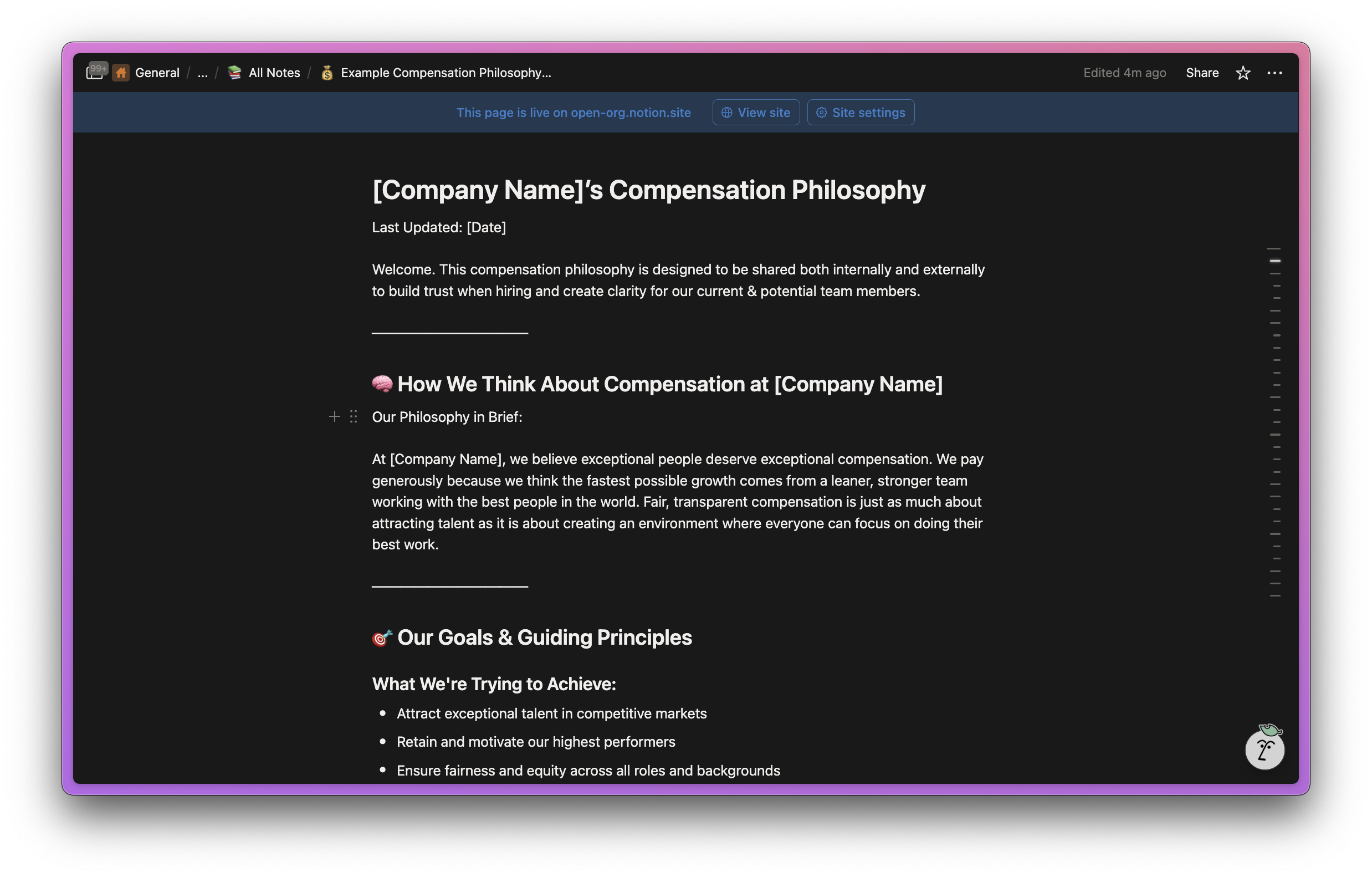 This is an editable compensation philosophy template built by us at Open Org, inspired by our own template, and also other best-in-class examples like Juro, Posthog and Whereby. You can tailor this to your business & context in minutes by copying the prompt in the resource page, and pasting into Gandalf AI ✨ (Instructions in page) - Good luck!