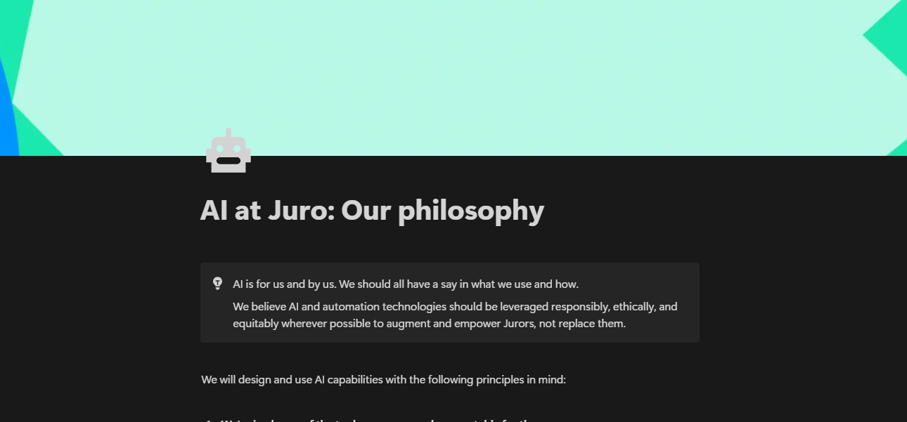 Juro's open-sourced AI Philosophy, which was co-created by them over 3 days as a whole team and sheds light on how they use & leverage AI together in a responsible, safe way.