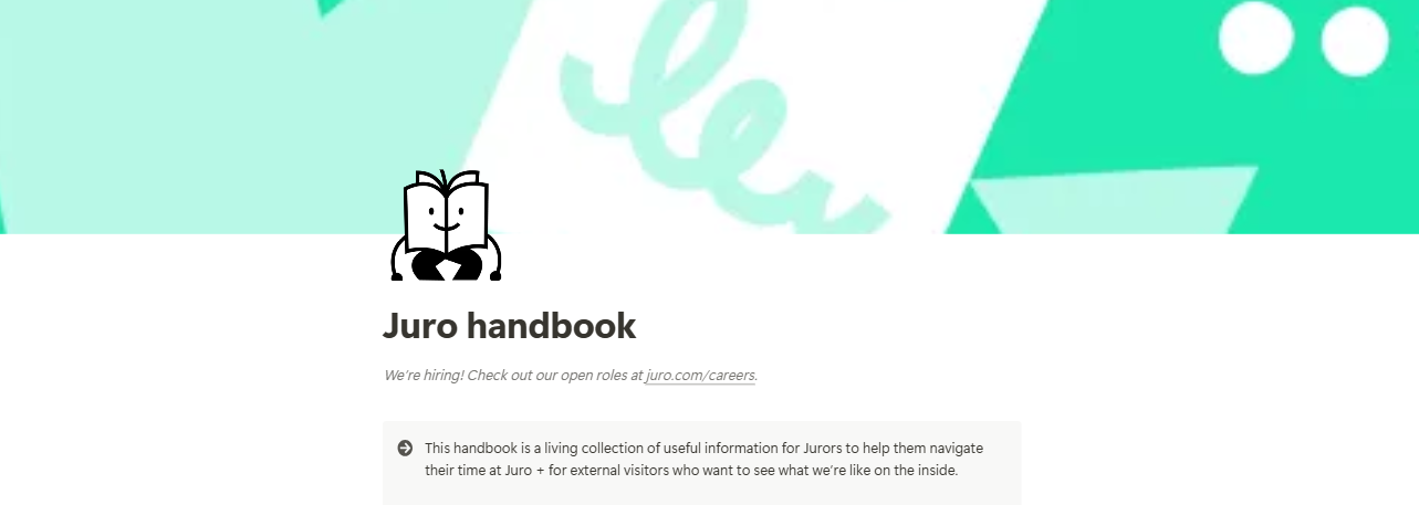 This handbook is a living collection of useful information for Jurors to help them navigate their time at Juro + for external visitors who want to see what we’re like on the inside.