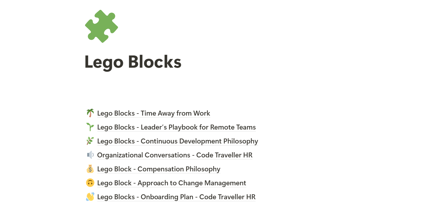 Lego Blocks is a template library created by Kim at Code Traveller HR, comprising of templates covering things like compensation philosophy, remote leadership, career frameworks, onboarding and more.