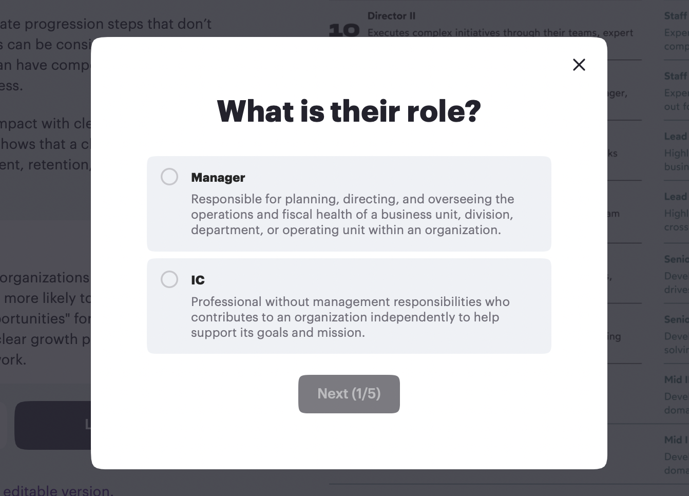 Create a leveling framework including individual contributor and manager tracks with level definitions, example behaviors and progression guidelines based on your company size and growth rate.