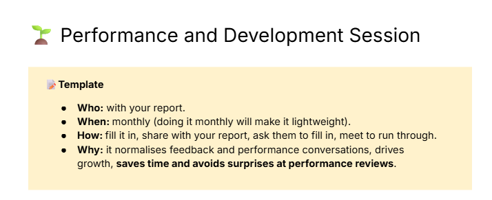 A template for managers to use to discuss and review performance on a continuous basis (rather than waiting for review period).