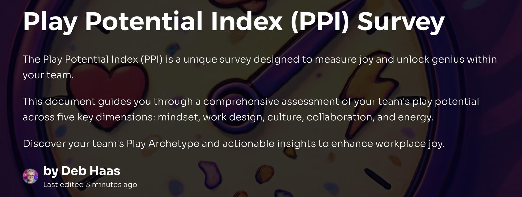 The Play Potential Index (PPI) helps teams measure where joy, play, creativity, and trust are thriving - and where they’re buried under meetings, metrics, and “let’s circle back” emails.