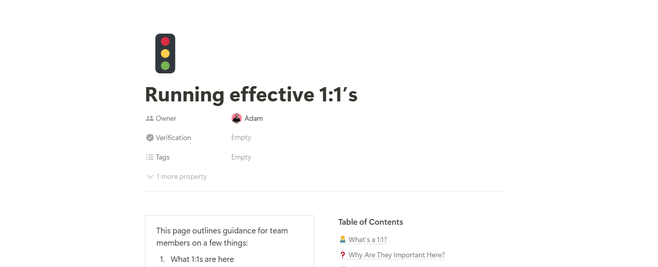 This is a page from Open Org's Performance Playbook Template built on Notion, which might act as a handy template to build out your own documentation around how to run effective 1:1's in your org.