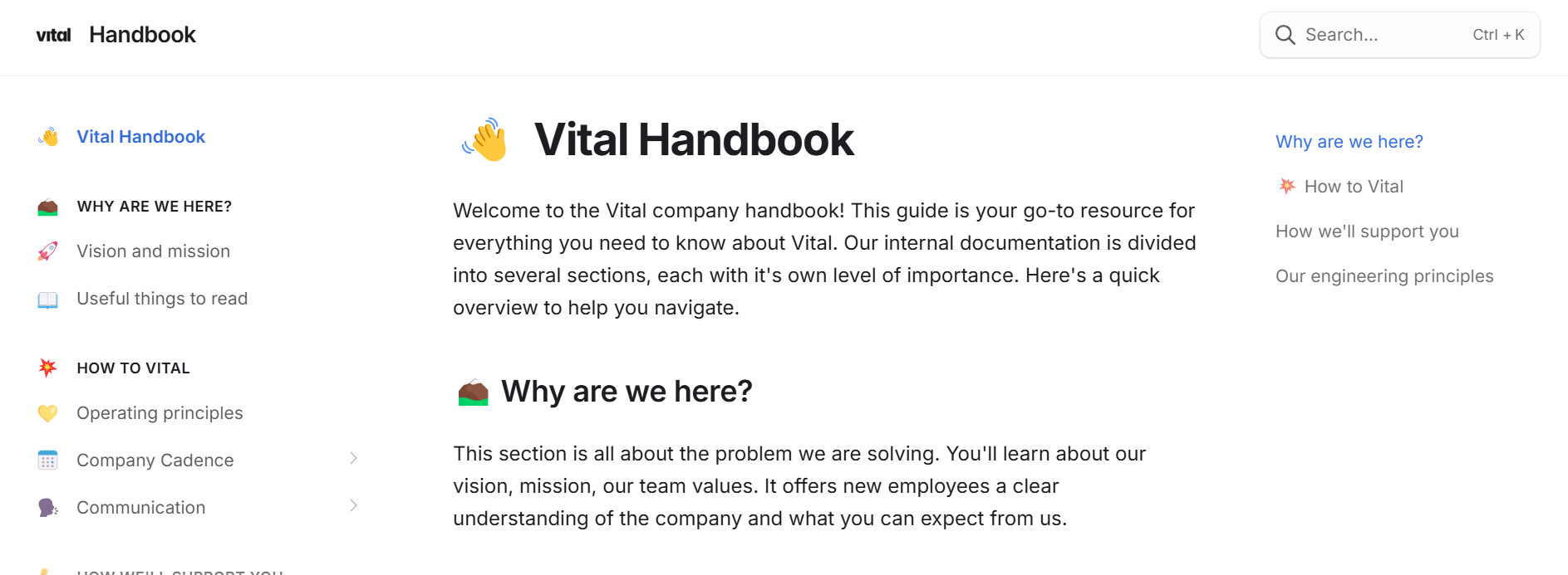 Vital's Open Employee Handbook, built on Gitbook, which has some great pages covering things like Operating Principles, Company Cadence, Communication, and more.
